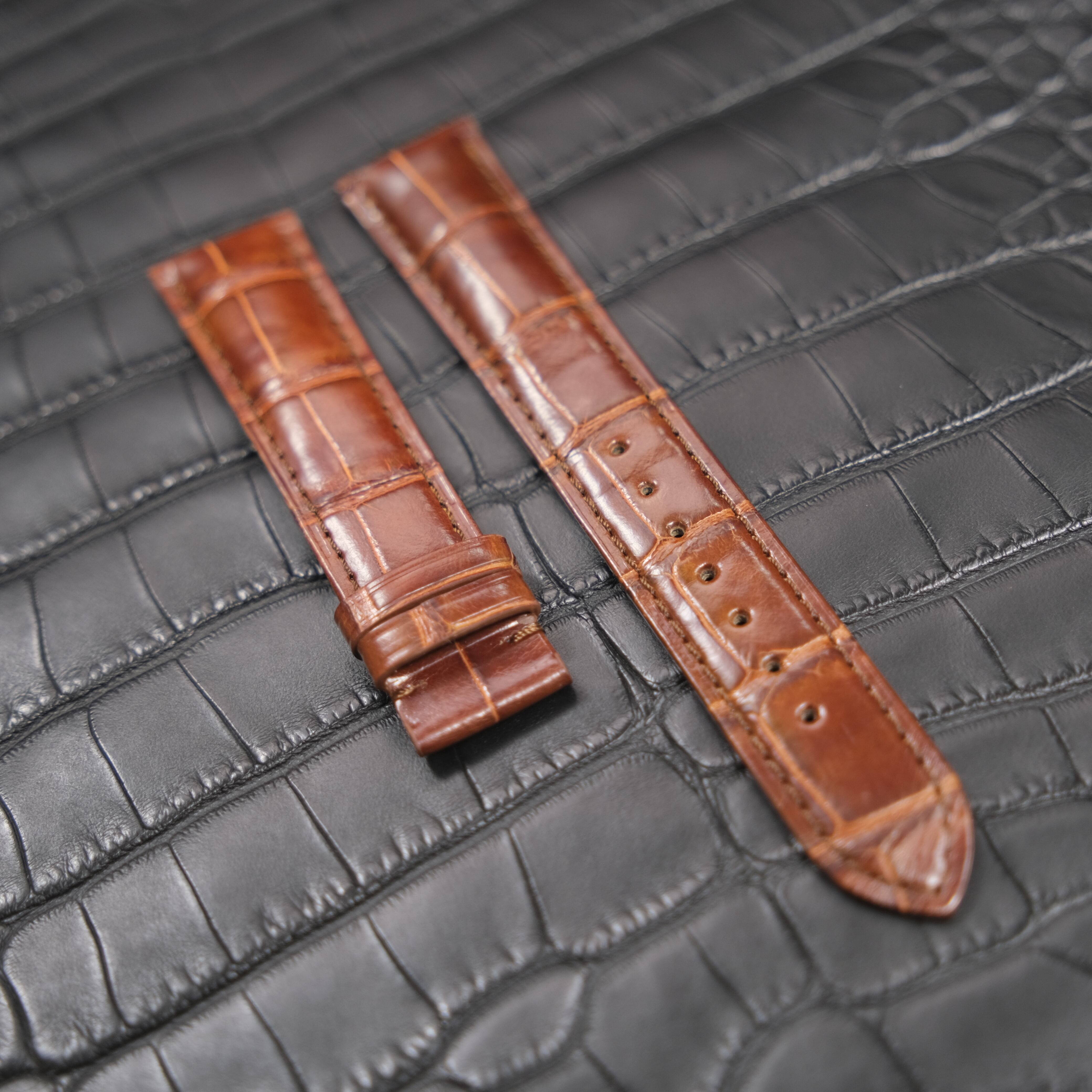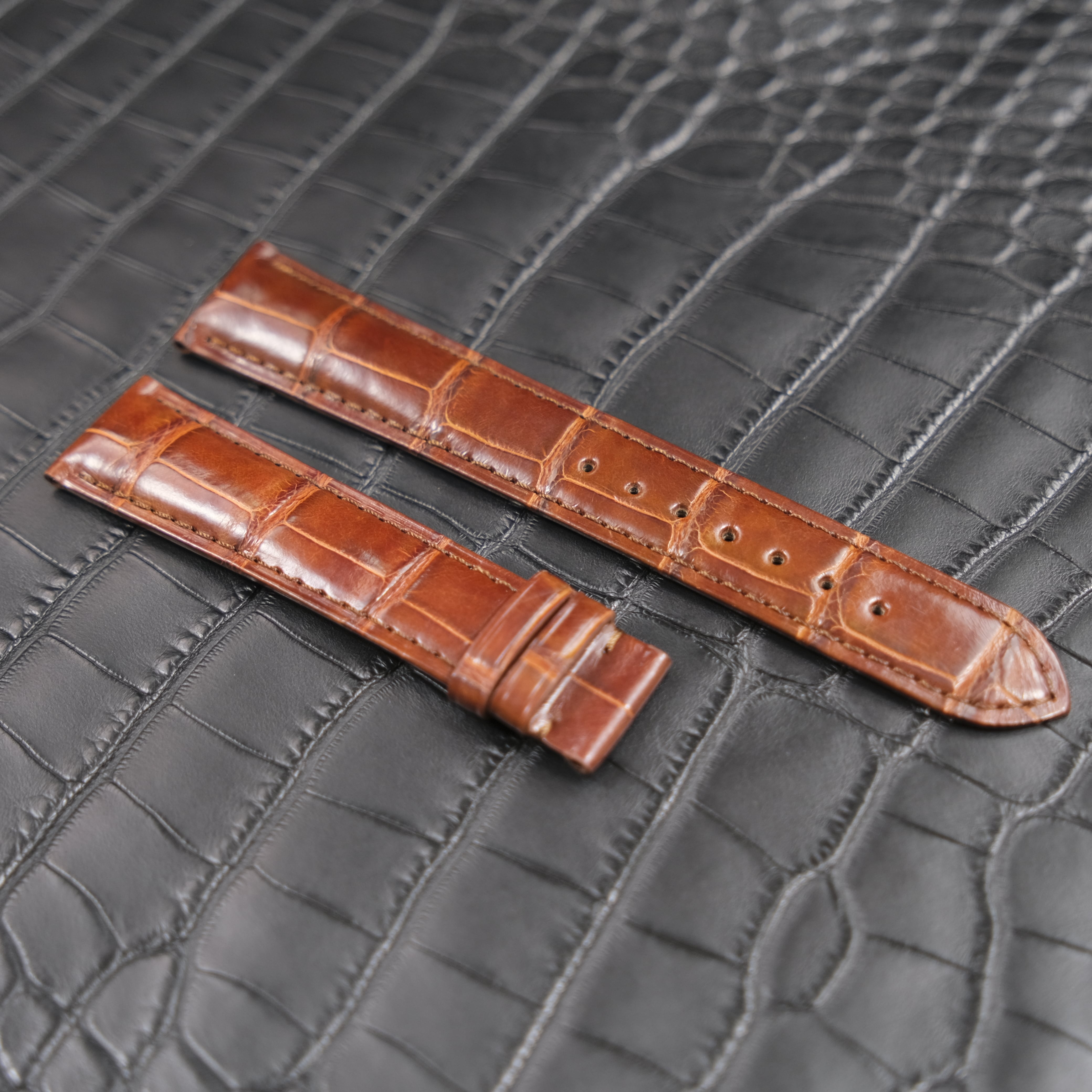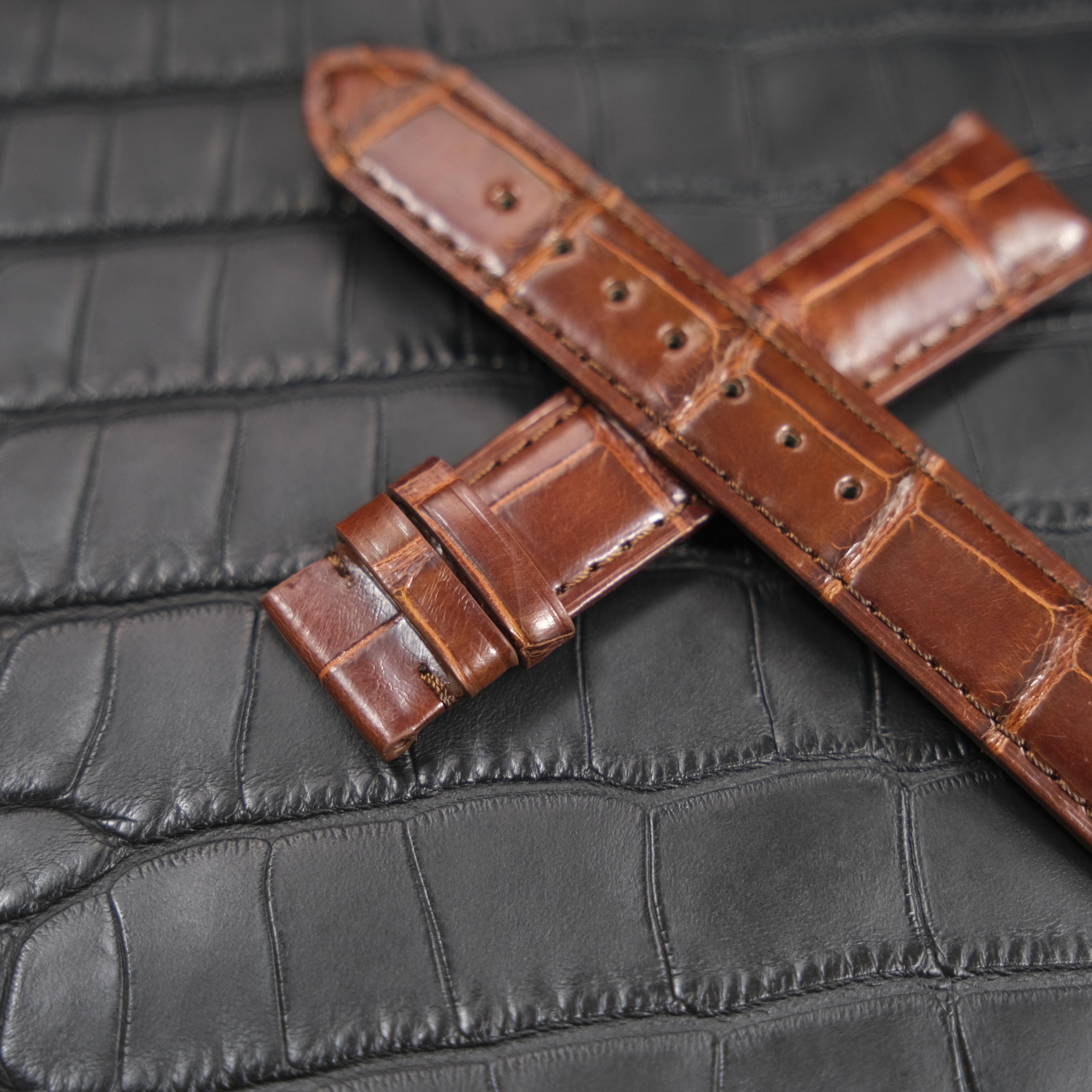 クロコダイルレザー 腕時計用ベルト 本物ワニ革 シャイニング加工 交換ベルト ブラウン 各サイズ