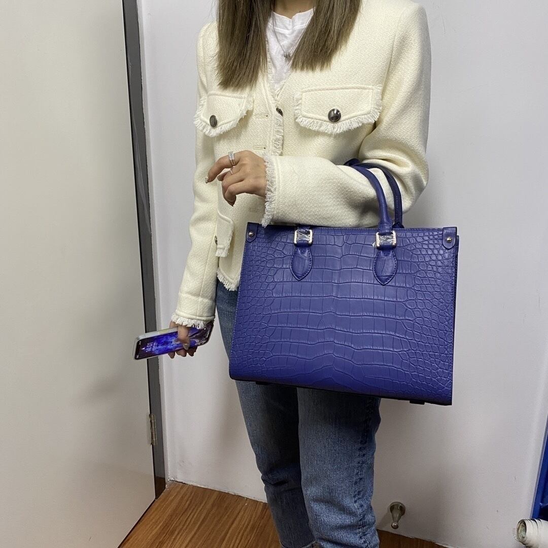 最高 クロコダイルレザー ワニ革~腹革センター取り マット加工 A4/PC対応 ビジネス/ハンドバッグ トートバッグ 大容量 ブルー